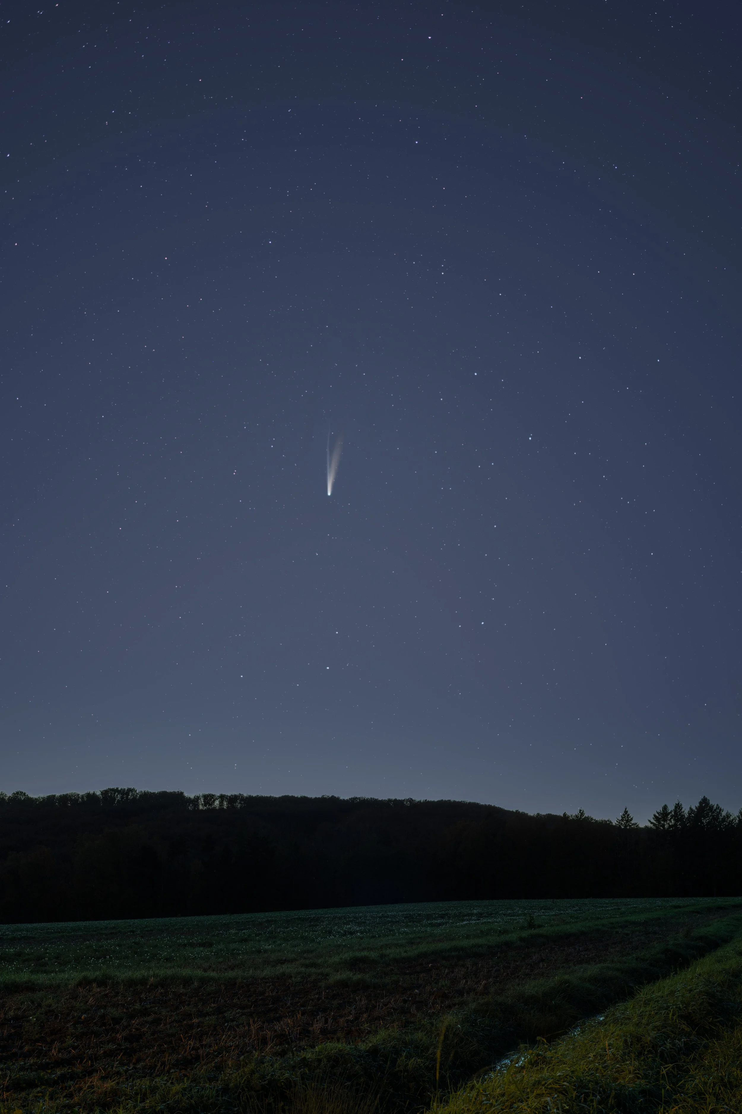 Après des semaines de brouillard et de pluie, une petite fenêtre de beau temps m’a permis de photographier, tardivement, cette magnifique comète.